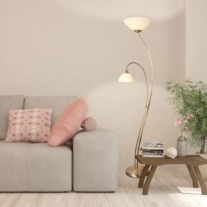 Voeg tijdloze elegantie toe aan je interieur met de klassieke vloerlamp met leesarm 6838BR uit de Luxora-serie. Een klassiek ontwerp dat zelfs in moderne inrichtingen goed tot zijn recht komt. De vierkante buizen bieden een stijlvolle ondersteuning voor het geel/crèmekleurige glas. De vloerlamp is voorzien van 2 x een E27 fitting en een dimmer verwerkt in het snoer. Deze lamp heeft zowel een uplight als een zijarm. Beide kunnen afzonderlijk worden geschakeld. De uplight is dimbaar, terwijl de zijarm alleen aan/uit kan worden gezet.