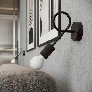 De belangrijkste viool hier is de gloeilamp, die zichtbaar wordt door een wirwar van zwarte draden. Het is aan jou welke uiteindelijke look je de lamp geeft. Alberto ziet er net zo geweldig uit met Paola-lampen als melkachtige LED’s. Plaats dezelfde lichtbron in de plafondlamp en in de wandlamp aan de zijwand en een samenhangend lichtarrangement is klaar.